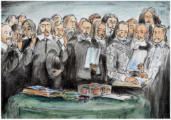 Ein Spanier und sechs Niederländer beschwören im Rathaus zu Münster den Spanisch / Niederländischen Frieden